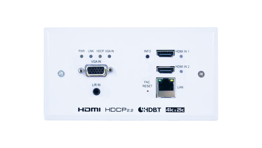 Questo interruttore per piastra a parete HDBaseT con gestione del segnale è uno switch HDMI e VGA con incorporamento audio e uscita HDBaseT. La piastra a parete è progettata per l'uso con custodie di dimensioni UE a due bande. Questo trasmettitore può inviare video / audio ad alta definizione non compresso su un singolo cavo fino a una distanza di 100 metri a 1080p a 60Hz. Gli ingressi HDMI supportano risoluzioni fino a 4K a 60Hz (4: 4: 4, 8 bit) e l'ingresso VGA supporta risoluzioni fino a WUXGA (RB). Con l'uso dell'ingresso audio da 3,5 mm, l'audio stereo può essere incorporato anche con sorgenti VGA o DVI / HDMI. Nonostante la limitazione della larghezza di banda di 10.2Gbps di HDBaseT, è possibile supportare sorgenti video 4K UHD HDMI ad alta larghezza di banda, fino a 4K @ 60Hz incluso (4: 4: 4, 8-bit), che verranno convertite automaticamente in colore a 8 bit, oppure Spazio colore 4: 2: 0 quando necessario.