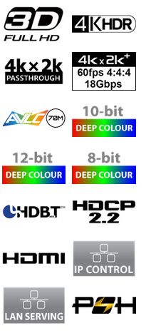 - L'AVLC integrato (Adaptive Visually Lossless Compression) si attiva quando i requisiti di larghezza di banda della sorgente sono superiori a 10,2 Gbps (340 MHz) consentendo il supporto di fonti fino a 18 Gbps (600 MHz) senza perdita di qualità visiva tramite ricevitori HDBaseT compatibili