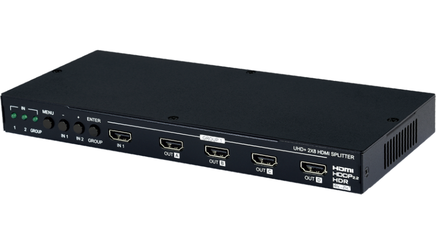 Questo Splitter è una soluzione avanzata che fornisce supporto audio e video ad alte prestazioni tra cui HDR e altre funzionalità definite dalla specifica HDMI 2.0a. Le sorgenti video HDMI UHD 4K, fino a 4K @ 60Hz (4: 4: 4, 8-bit) e 10/12 bit con HDR inclusi, possono essere trasferite alle 8 uscite. Sono inoltre supportati il passaggio di più formati audio digitali come LPCM 7.1, Bitstream e Advanced HD Bitstream con velocità di campionamento audio fino a 192kHz. Un motore di gestione HDCP indipendente per ogni uscita garantisce prestazioni HDCP stabili. Questo splitter include anche una speciale "Modalità gruppo" che consente all'unità di funzionare come due splitter 1 × 4 indipendenti. Quando la Modalità gruppo è abilitata, ciascuno dei 2 ingressi HDMI viene indirizzato al proprio set discreto di 4 uscite. Quando è collegata una combinazione di display con specifiche diverse, ogni uscita può essere configurata per scalare da 4K a 1080p o applicare la conversione dello spazio colore (da 4: 4: 4 a 4: 2: 0), come appropriato. È incluso anche il supporto per il comando CEC "sorgente attiva" per ripristinare periodicamente la selezione degli ingressi su display collegati compatibili CEC. Questa unità offre un set intuitivo di controlli sul pannello frontale con un OSD e opzioni di controllo RS-232.