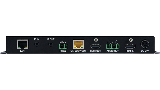 Questo trasmettitore di scaling da HDMI a HDMI / HDBaseT può inviare audio / video non compresso insieme a controllo, Ethernet e dati audio extra su una singola passata di cavo Cat.5e / 6/7 fino a 100 m. Sia l'ingresso HDMI che l'uscita HDMI locale supportano segnali video fino a 4K a 60Hz (4: 4: 4, 8 bit). Per la trasmissione tramite l'uscita HDBaseT, il segnale può essere convertito in 4K @ 60Hz (4: 2: 0, 8 bit) o 1080p @ 60Hz, se necessario, per adattarsi alle limitazioni della larghezza di banda di HDBaseT. Sono disponibili anche semplici schemi di prova HDMI da 18 Gbps. Il controllo dei dispositivi remoti è possibile tramite RS-232 o IR bidirezionale e tramite una connessione LAN. Un'uscita audio analogica bilanciata offre agli utenti un'ulteriore flessibilità audio. Il design PoH a 48 V può alimentare il ricevitore collegato (PD), eliminando la necessità di un alimentatore aggiuntivo mentre il trasmettitore stesso è alimentato tramite l'alimentatore locale a 24 V.