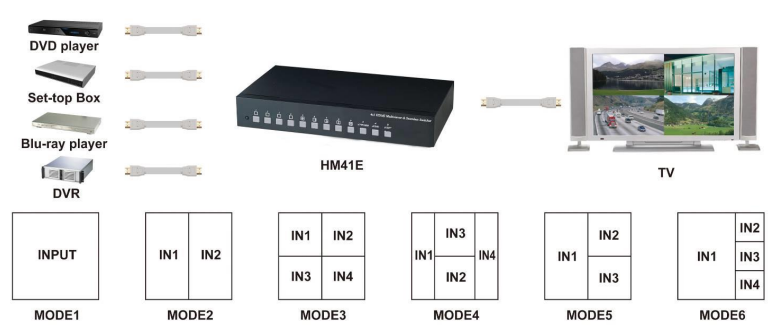 Il multi-viewer HDMI Quad consente di visualizzare segnali video HDMI da 4 diverse fonti su un unico televisore HD. Supporta Quad / POP / schermo intero con 6 modalità, la funzione speciale integrata nella funzione di commutazione automatica tra 4 diverse fonti. È un'operazione facile con una grande funzionalità per la visualizzazione o il monitoraggio di più video su uno schermo contemporaneamente da dispositivi video come computer, lettore Blu-ray, decoder, DVR, videocamera di sorveglianza, ecc. Perfetto per l'uso in sorveglianza, pubblicità, istruzione, industria e applicazioni commerciali, home theater privati ecc.
