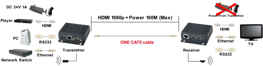 4K HDMI HDBaseT & IR/RS232/Ethernet/PoH CAT5e Extender 100M