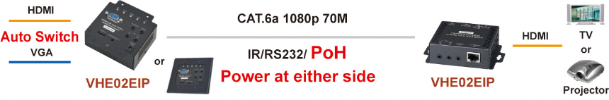 Supporta HDMI fino a 4K a 60Hz YUV4: 2: 0 e VGA fino a 1920 x 1200 a 60Hz, con video/audio HD, IR bidirezionale e RS-232, alimentazione a 2 vie su cavo CAT5e/6. È la soluzione ideale per estendere PC/laptop a un output di visualizzazione a un'applicazione proiettore/monitor. Con una piastra metallica sull'unità trasmettitore per fornire all'installatore un'installazione flessibile per adattarsi all'unità TX a parete o su un tavolo da riunione, che è un'applicazione perfetta nella sala per videoconferenze.