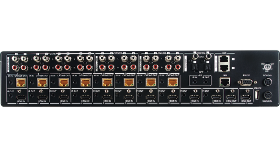 Il supporto LAN integrato consente di estendere la rete 100BaseT attraverso i ricevitori HDBaseT compatibili a smart TV o proiettori. Vengono forniti schemi di test generati internamente (fino a 1080p) per facilitare l'installazione, fornendo un modo semplice per verificare la funzionalità sia della matrice che del sink. La funzionalità PoH (Power over HDBaseT) fornisce alimentazione remota ai ricevitori HDBaseT compatibili, offrendo una maggiore flessibilità nelle installazioni. Il controllo avviene tramite i pulsanti del pannello frontale con menu OLED, WebGUI, Telnet, RS-232 o telecomando IR.
