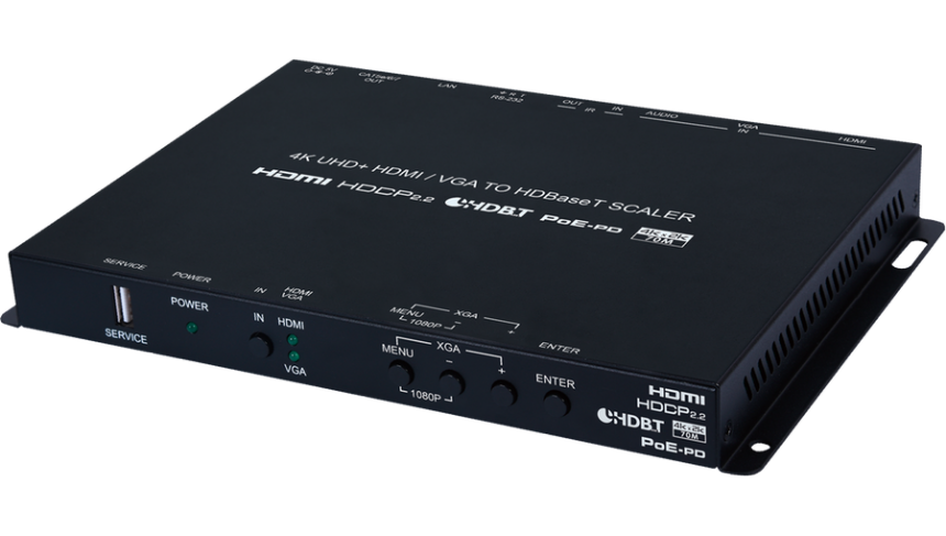 4K60 (4:2:0) 2×1 HDMI/VGA over HDBaseT Scaler with IR, RS-232, PoH (PD), LAN & Audio Insertion